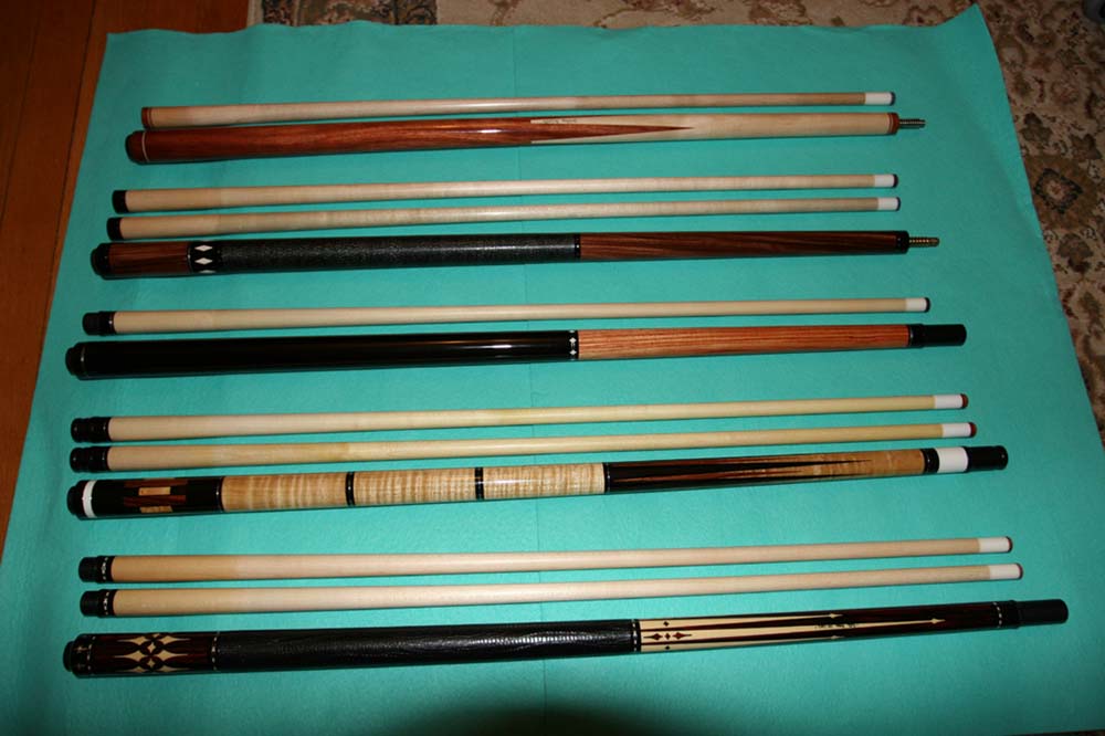 4th cue is a new 12 pt Murrell. 6 high points in ebony and 6 low cocobolo. Segmented curly maple handle. Silver ringwork all around. Intricate Ebony buttsleeve with alternating uses of maple and cocobolo. The joint and the hoppe ring is phenolic. 2 shafts. Weight is about 18.7-19oz naturally balanced, no weight bolt.