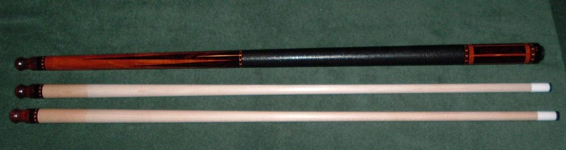 The cue is made of highly figured cocobolo and what I believe to be either Chatke kok or bloodwood. There are six hi-lo points with no veneers and six rectangular windows in the butt. Dave has done an amazing job of making the grain appear to be continuous in the butt from window to window, and I think the points are all cut from one piece, so the grain is continuous there, too.