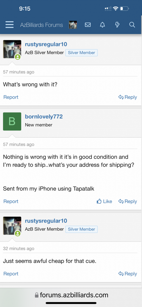 rustysregular10 AzB Silver Member Silver Member Oct 12, 2021 #1 Just got private messages from bornlovely772 and got bad vibes. He was trying to sell me a c-17 McDermott with 2 shafts for $245 shipped. Attachments 82B34B45-81F5-4A45-A67F-215E17CCA3E8.png 264.9 KB · Views: 92 DAEA93FB-0B14-4CB3-A3D6-208A7A025D28.png 270.3 KB · Views: 95