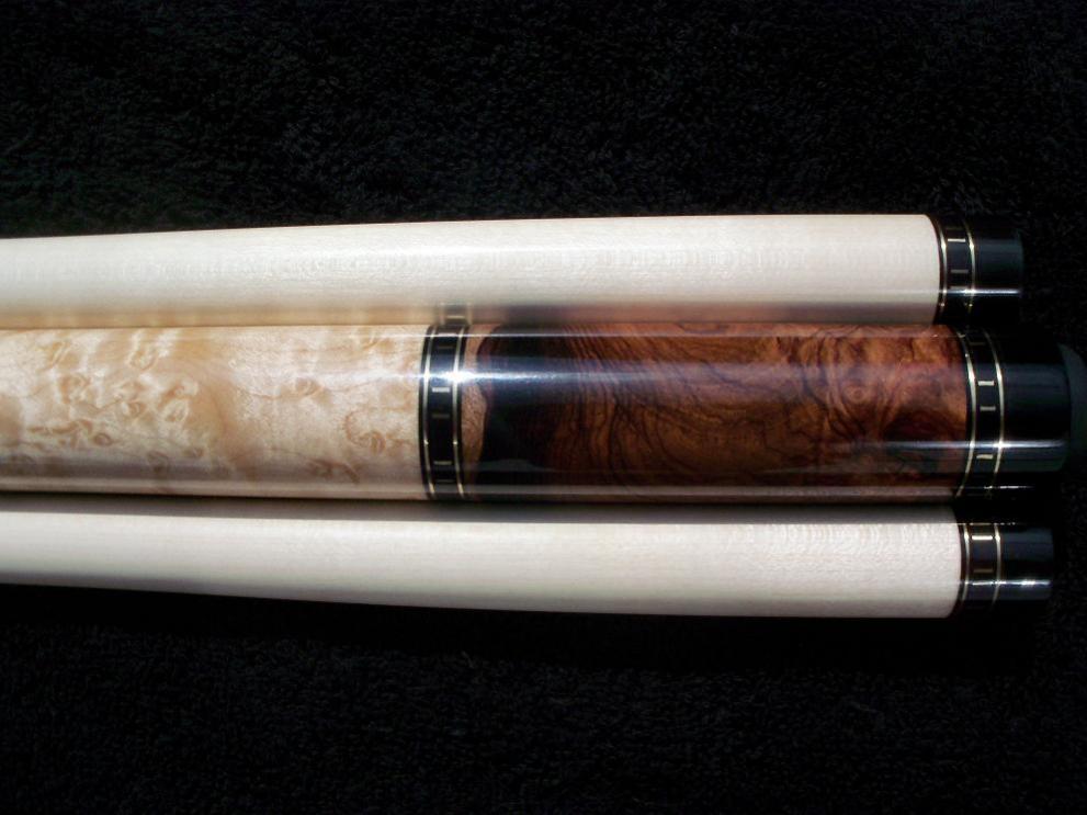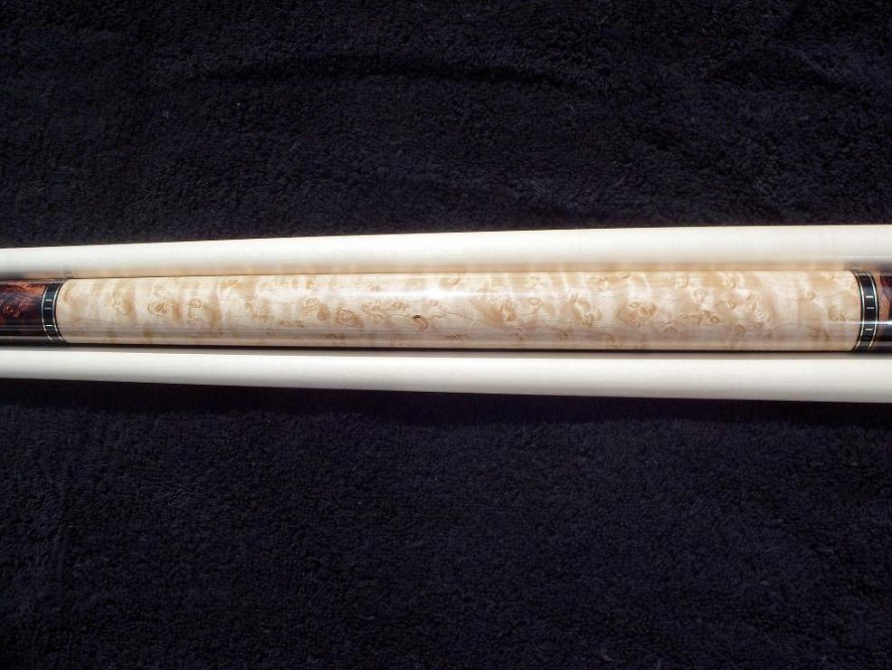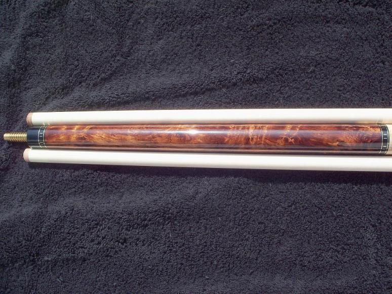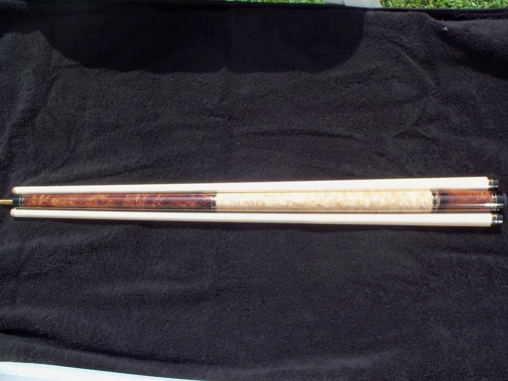 Hi, I have for sale a cue with crazy Rosewood burl forearm and buttsleeve with a highly figured birdseye/curly maple handle made by C.J. Stevens of Hope Mills,N.C. C.J has owned a billiard supply store for a long time and several years ago started making cues for local customers and players in his pool league. C.J plays pool very well himself. This cue hits extremely well and is absolutely beautiful. I like the hit of this one so well I ordered a bigger cue from him. This cue has less than 2 hours play on it and is in like new condition.Cue is straight together and apart. I will take Trade pending including insured S&H and paypal fees, for the cue with 2 very nice shafts.Cue is 58 inches long with a 3/8x11 pin.