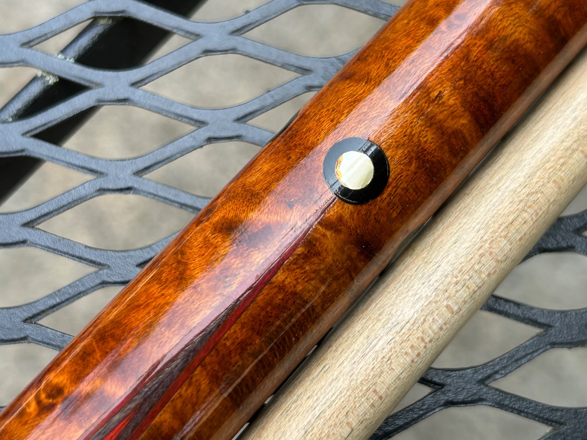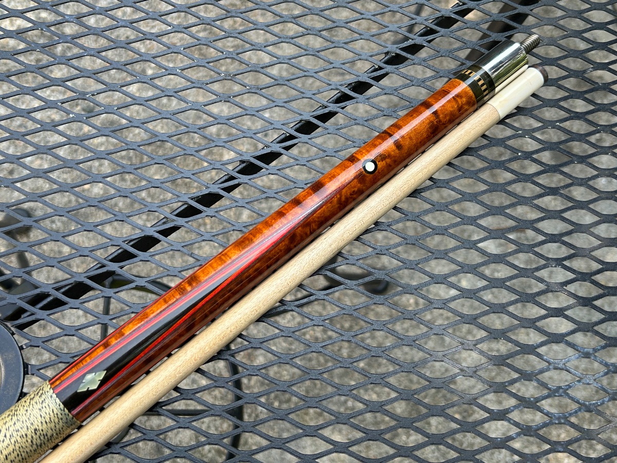 Auerback... I picked up an Auerback with the gold JA logo on the butt cap in a trade probably 25 years or so ago and still have it. Cocobolo forearm and butt sleeve with a birdseye maple handle. Nice cue that people mistake for Bluegrass from across the table.