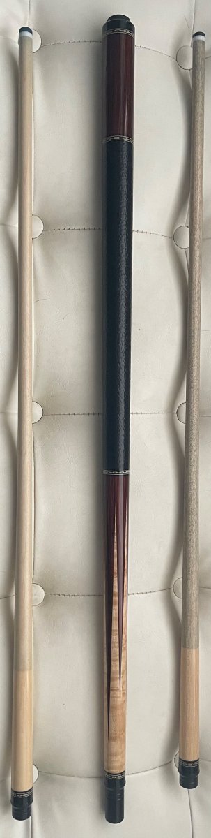 58", 19 oz. Mike Capone cue with 3 high, 3 low cocobolo points into BEM, leather wrap. There is a tiny ding on the butt sleeve.