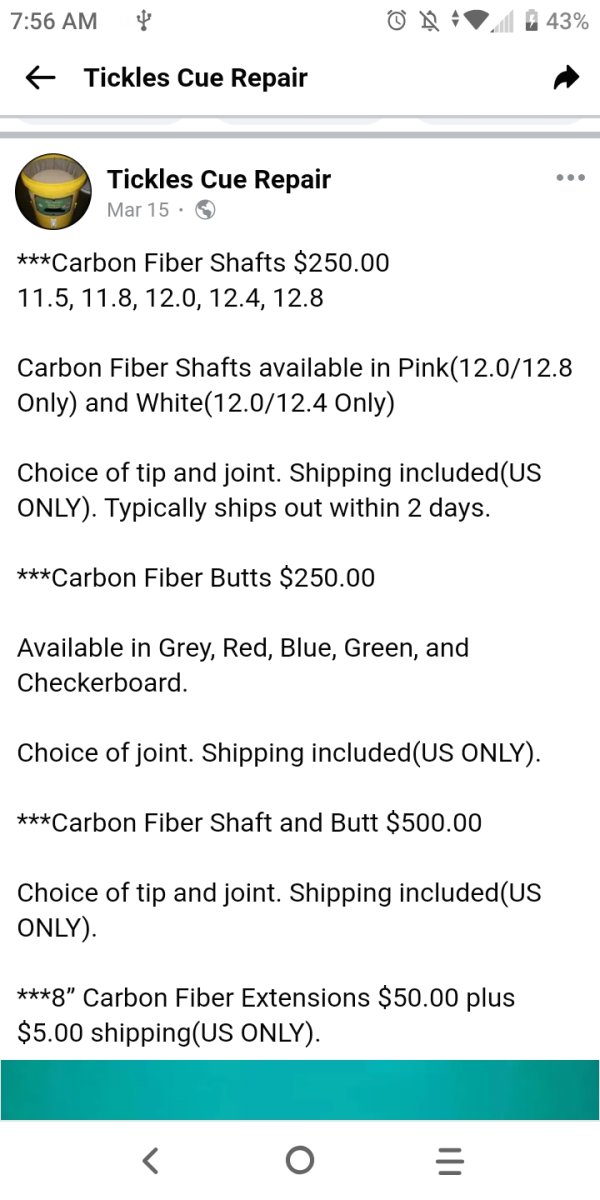 guy on facebook named david tickle has new cf shafts in most connections in tip sizes from 11.5 and up, whatever tip you want that hes got instock
