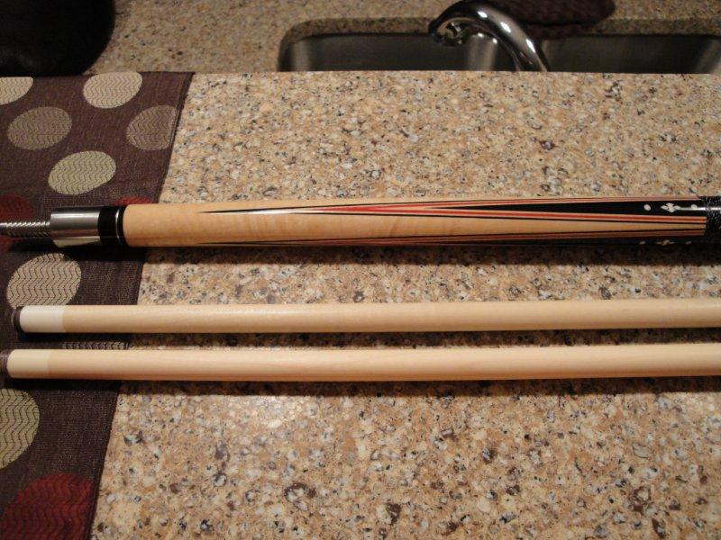 Up for raffle is a very nice Carolina Custom Cue. Ivory inlays throughout. Butt weighs 15.6 oz. 3/8x10 joint pin. Two 13mm shafts 1 new and 1 with very light, light play at 3.6 oz a piece. This cue will make a super nice player for somebody!!! It was 900 new. Cue rolls dead straight together and apart. I had this previously sold but the joint pin was offset. I took the cue back and had Carolina reset it and the cue is perfect. It rolls perfectly now. No nicks, dings or dents. Has some super minor light scratches in the finish but will not show up on camera. SUPER LIGHT!!