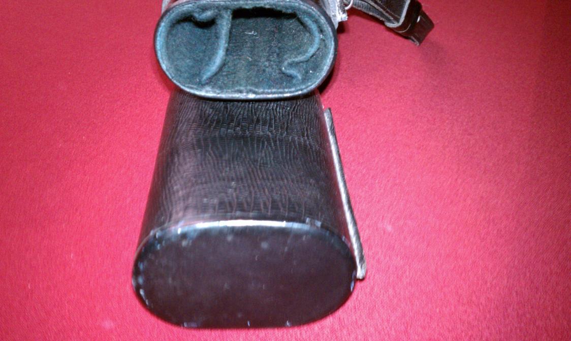 It looks like a Its George 1x2. The side stiched seams, the inside cover with matching leather. Does the strap adjust using a flat metal hook? If so, then that and the fellini style lock is consistent with an early Its George.