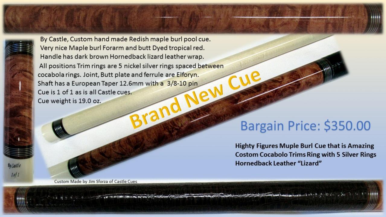 This cue is a 1 of 1 made by Jim and is completely brand new. It is made with a beautiful Maple Burl and features a Brown Hornback Lizard Wrap.