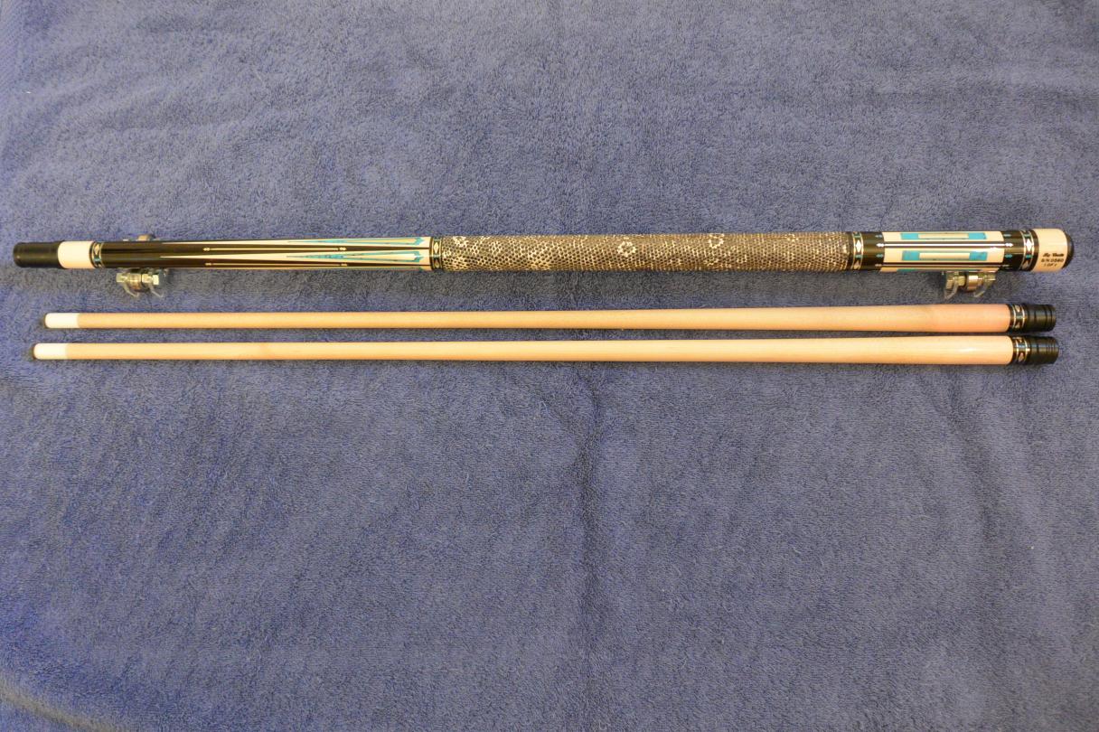I'm selling my Castle one of one custom cue. This cue is ebony forearm ebony butt this beautiful cue is loaded with sliver inlays, this cue is also loaded with real turquoise inlays, all while in this cue is micarta. This cue has a genuine ringtail lizard wrap. This cue is one beautiful cue, I'm selling it due to my back issues and net being able to play much anymore. This cue is one of a kind, I have to say it's one good looking cue. I'm asking $2650.00 for this beautiful cue, I'm not looking for any trades on this cue. If you have any questions please send me a PM, thanks.