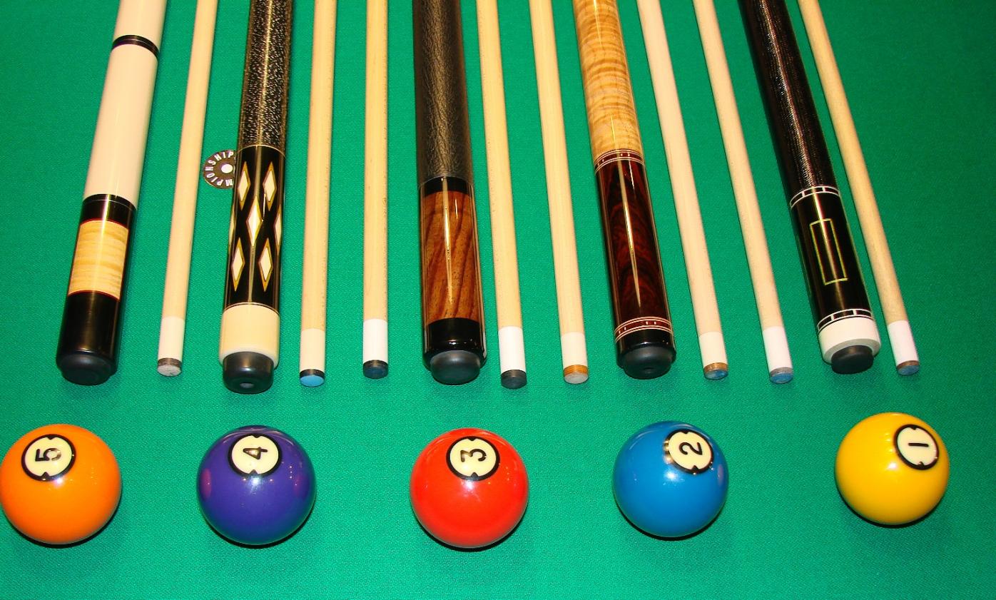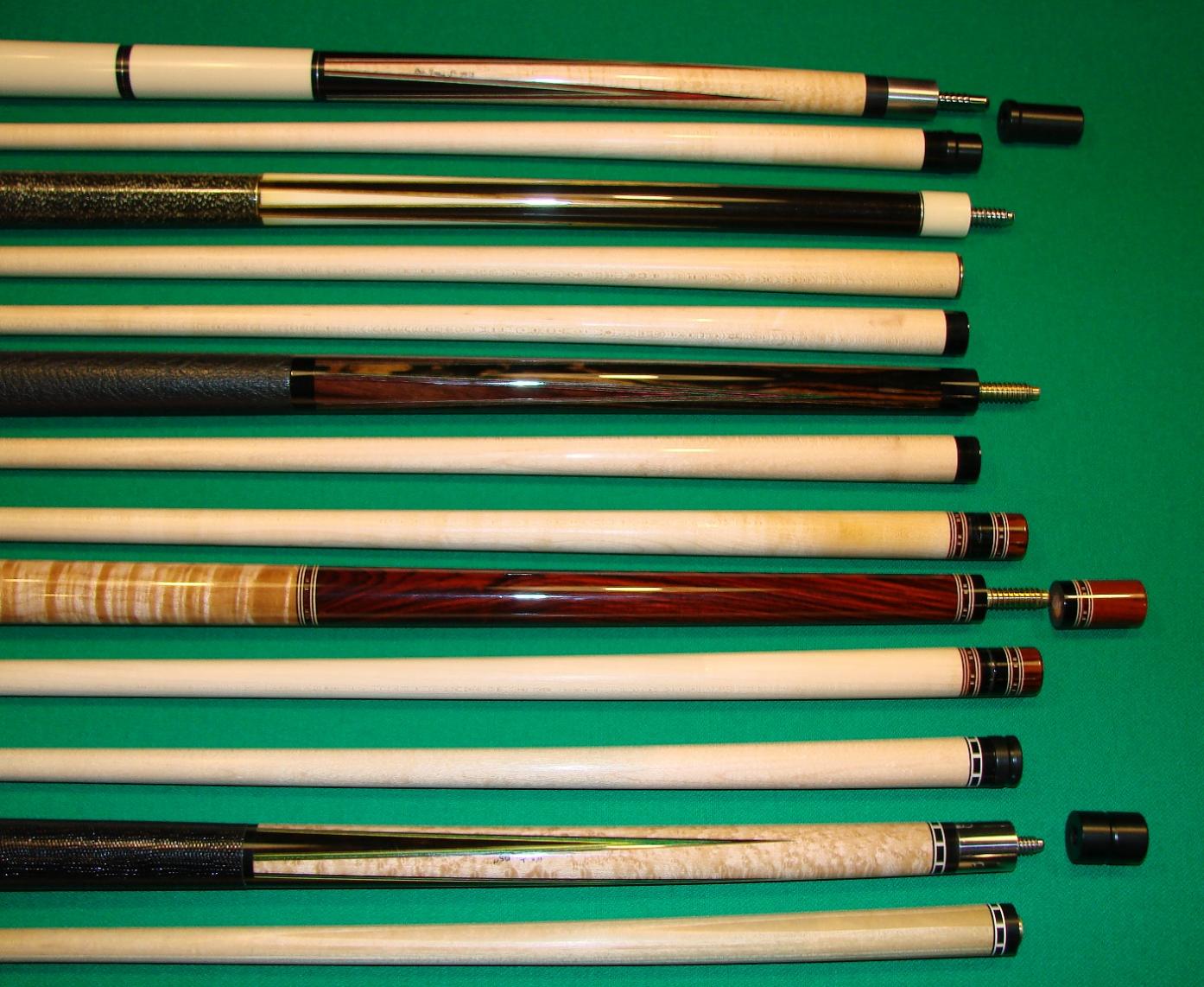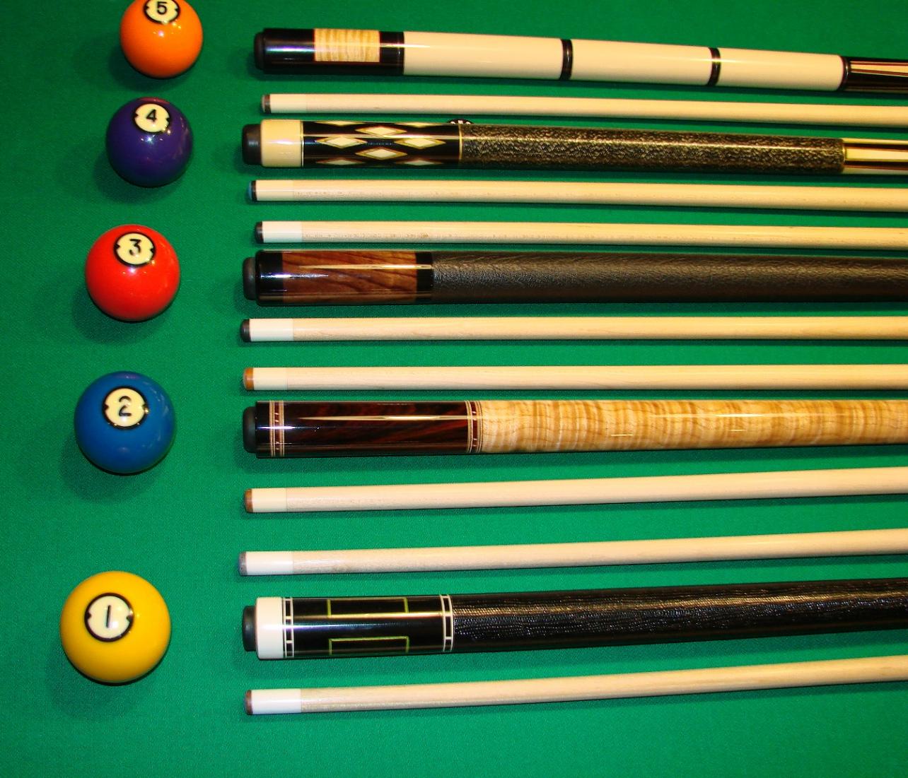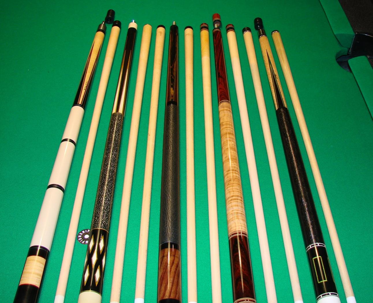 Here is a group of nice group of 5 custom made cues that are new or in great used shape with one being new, never chalked that are priced affordable.