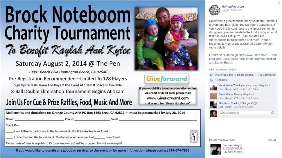 I miss my friend, and there are hundreds of people in Southern California who feel the same way. Not just pool players, either. If you're local to Orange County, please stop by the Pen in Huntington Beach on August 2 and help us celebrate the life of someone who gave much more than he took. He left our little corner of the world a better place than it would have been without him, and the sun is definitely not shining as bright now that he is gone. If you're not local, please consider donating through one of the links in the OP. Anything will help the two little girls who just lost their daddy, and all of the proceeds are going to them.