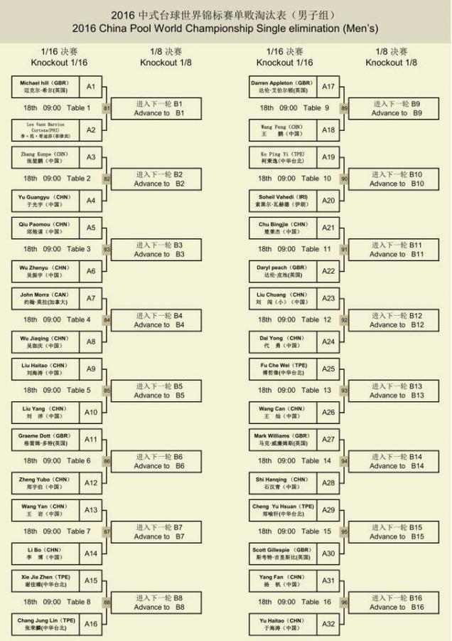 upstateAL AzB Gold Member Gold Member Silver Member Mar 17, 2016 #5 China Billiards World Championship Watch it Live http://www.ustream.tv/channel/turning-stone Final Brackets - Men's Final 32 and Women's Final 16, Starting tonight
