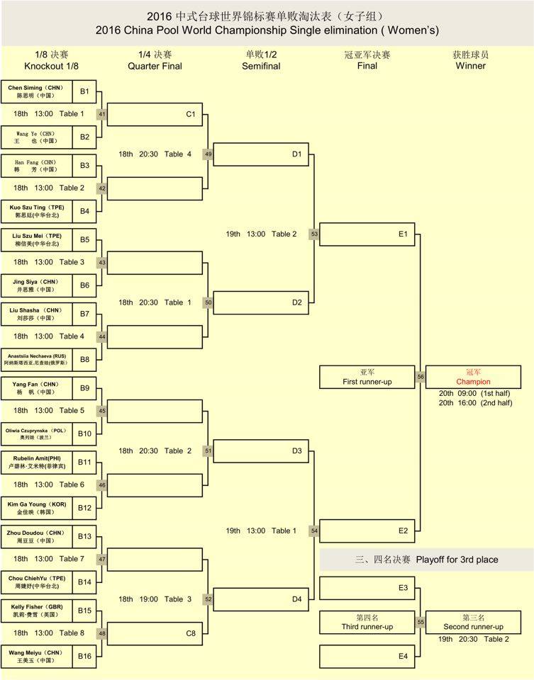 China Billiards World Championship Watch it Live http://www.ustream.tv/channel/turning-stone Final Brackets - Men's Final 32 and Women's Final 16, Starting tonight