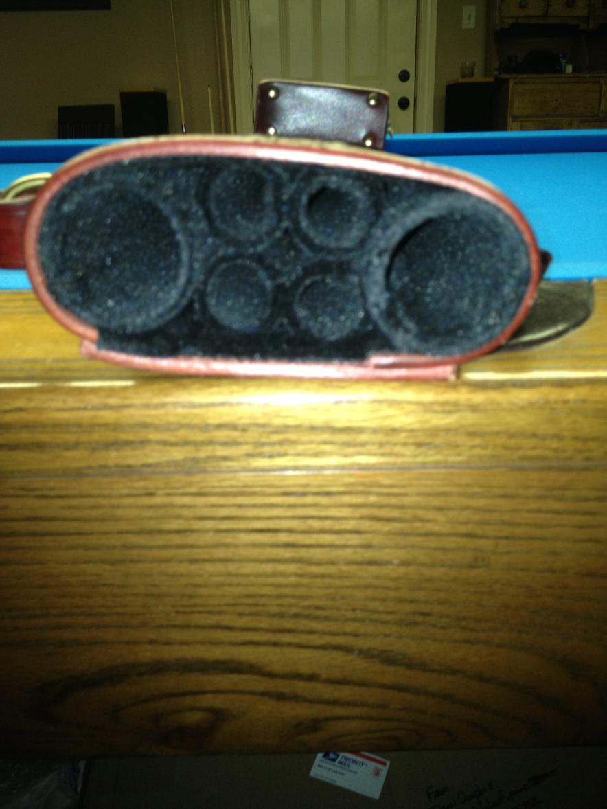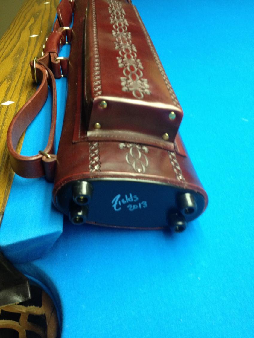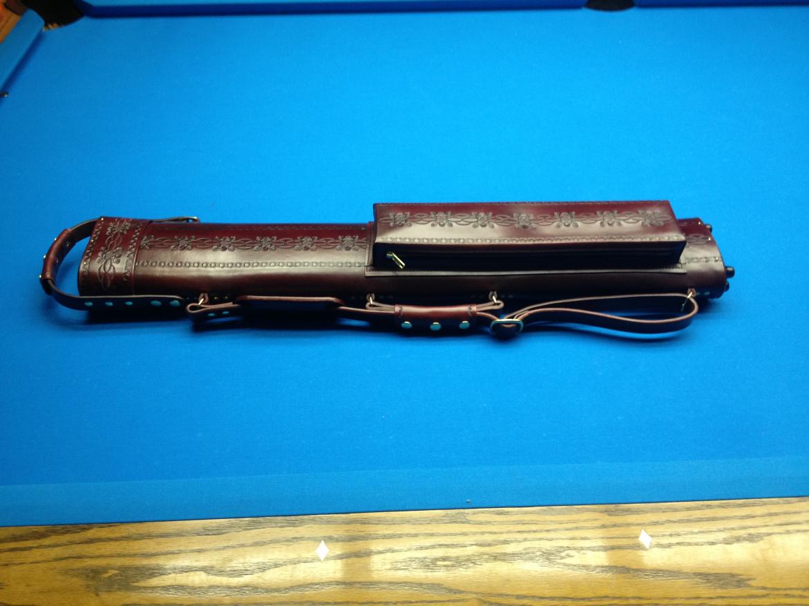 I just got this tonight and snapped a few quick ones with the iphone. My first impressions are that this case is built like a tank and I like it very much, if this is any indication of the quality we can expect from Chuck, he is a welcome addition to the custom case world. This is very old school design and construction and made from very heavy leather. The tube lining is very plush and holds the cue snug, no rattling around at all. Sorry for the sub-par pics but you can get an idea of what's up. IMG_1970.jpg (98.8 KB)