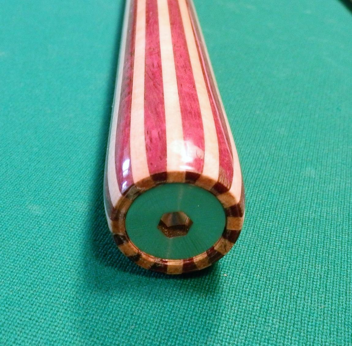 one piece butt purpleheart cue with 12 maple inlays. boattail and bumperless. 3/8 by 10 ss pin, natural color linen fiber rings, 12.8 mm, triangle tip, ferruless. Purpleheart, no bumper and ferruless makes for a very crisp hit, buy it, try it a FEW racks , if its not the cue for you. return for a full and prompt refund.