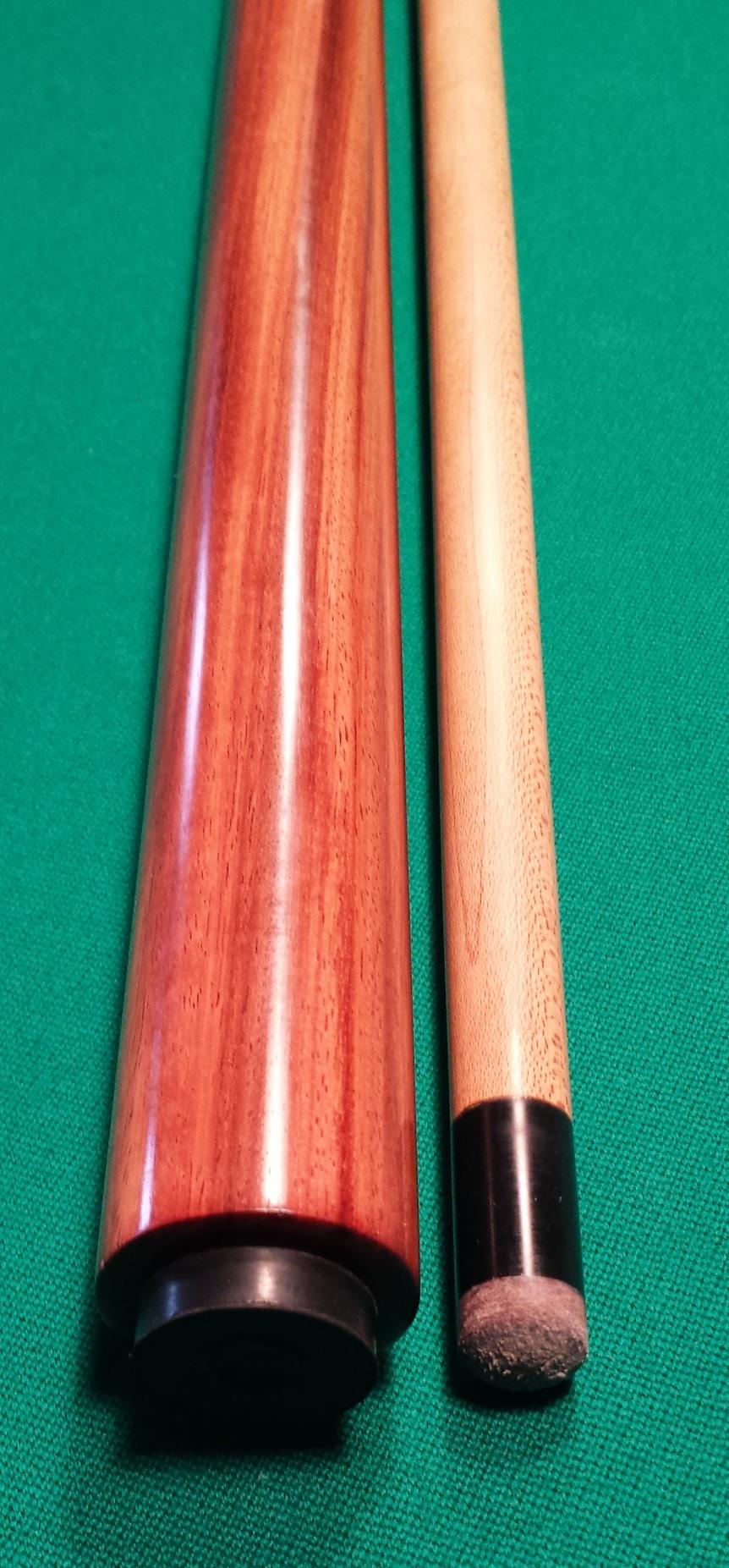 Brunswick butterfly house cue was the donor for the parts for this cue. 18.6 oz ,56 inch long butterfly sneaky with a 12.7 mm triangle tip, 3/8 by 10 ss pin. oil finish.