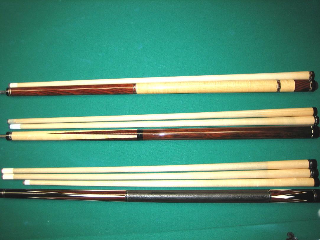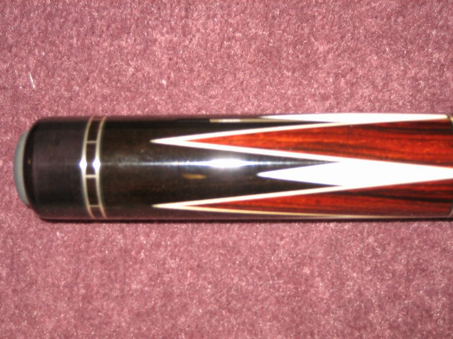 Bender:Ebony forearm. Cocobolo long points with maple veneer, and ivory short points; above and below wrap. 30 points total. A, B, C, D, and E sterling silver dash rings with ebony between the silver. This cue was recently refinished and has a brand new leather wrap (the shafts were not refinished). Flat-face joint with stainless steel pin. 2-13 mm shafts with ivory ferrules and 1 billiard shaft is included with this cue as well.