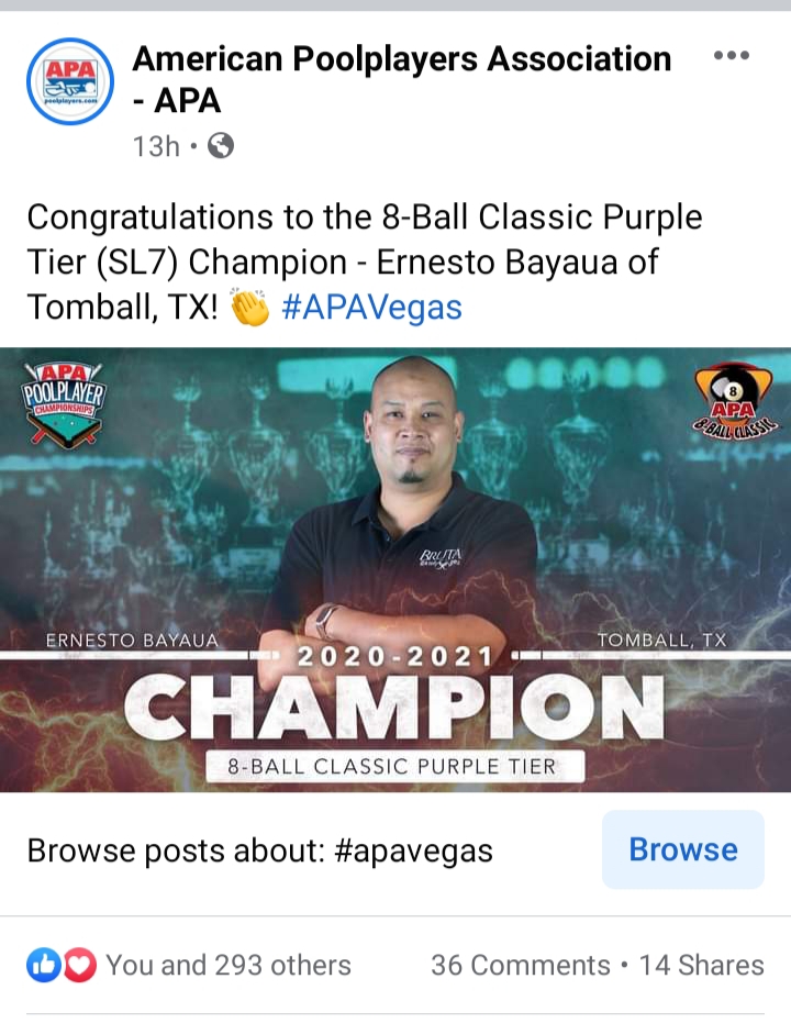 Congrats for winning tha apa 8 ball championships with a 4-2 victory.