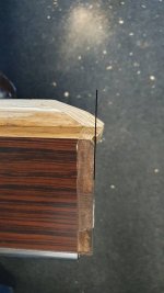 Now here is the rail in the sled on a corner pocket. Compound saw set exactly for opening angle and down angle as desired. Rail in perfect alignment using feather strip. Feed it into the sanding disc ever so gently and cut that pencil line in half. Very cool to observe!