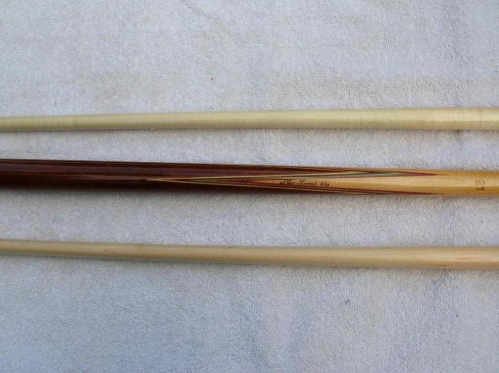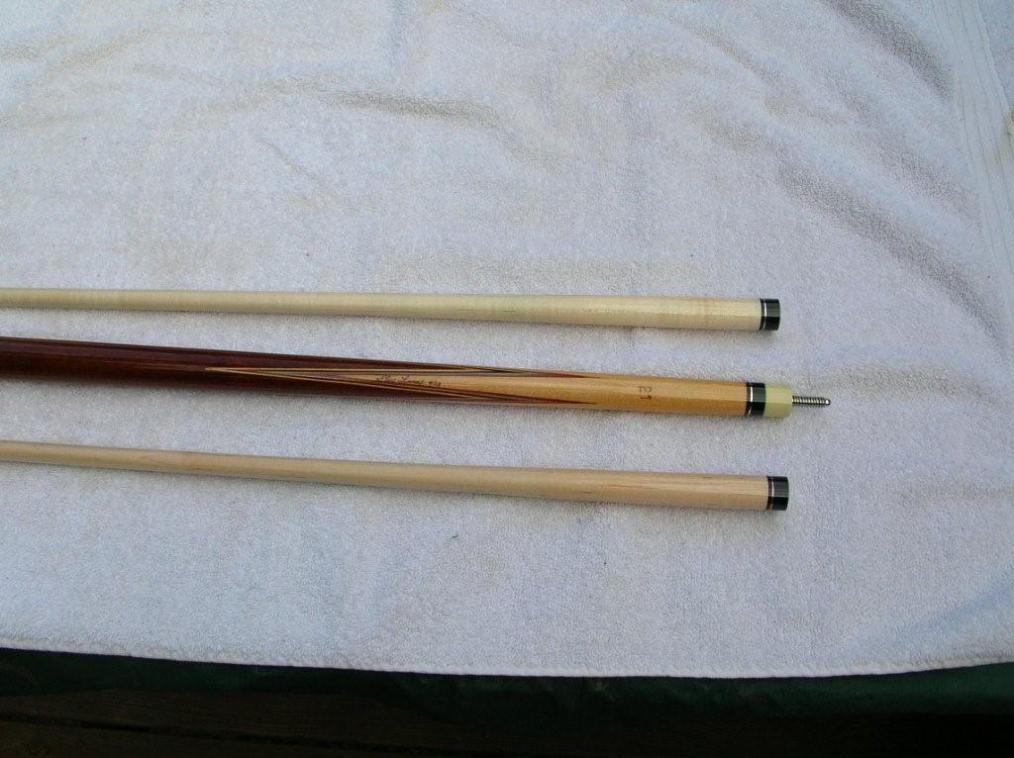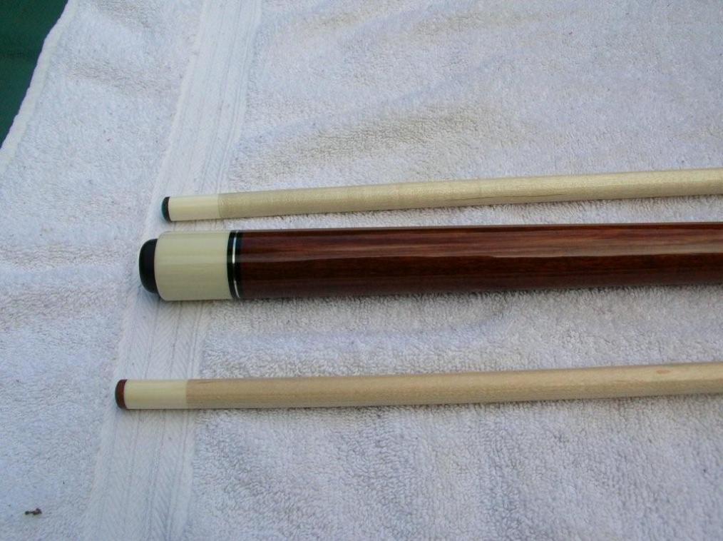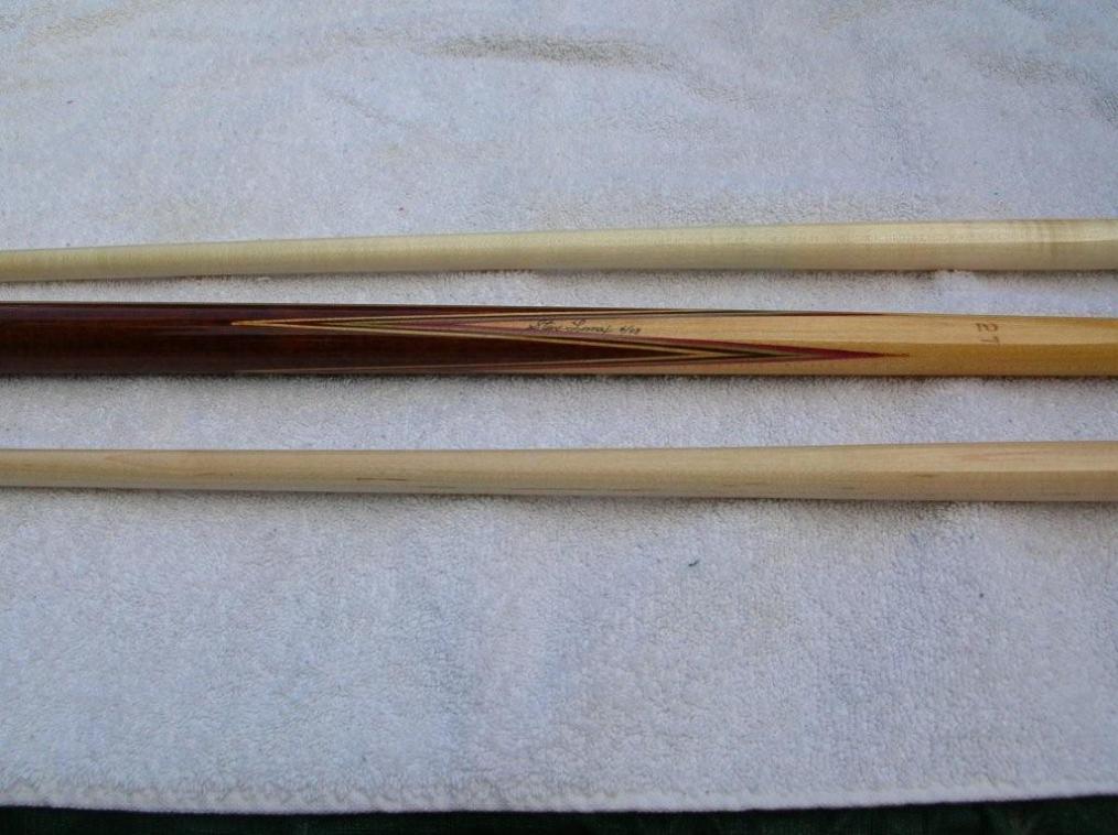 and was done 6/08. It has 2 Tascarella shafts with ivory ferrules. The joint and buttcap are ivory substitute. The joint is flat faced with 5-16/14 pin. It has a silver ring at butt and joint. The butt weighs 15.5 and the shafts are 4.0 and measure 12.75 with moori medium tips.The original weight was left on this cue by request. Really solid player. For Sale. Taking offers....