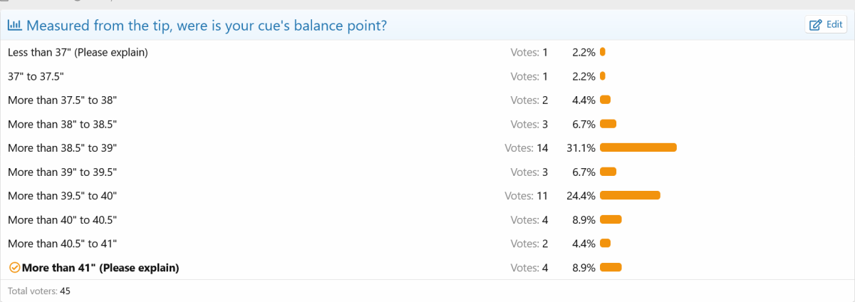 In another thread, I recently posted a link to data about measuring cue balance from over a decade ago. A lot has changed since then, especially the wide-spread adaption of low-deflection shafts, which would be lighter at the end than the old shafts, possibly changing how cues balance. So, maybe it's time to measure things again. If you don't mind, and have a couple of spare minutes, where does your cue with a low-deflection shaft balance--measured from the tip?