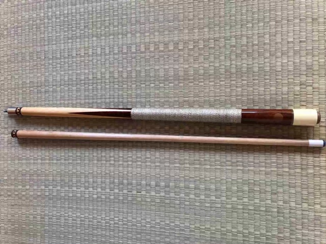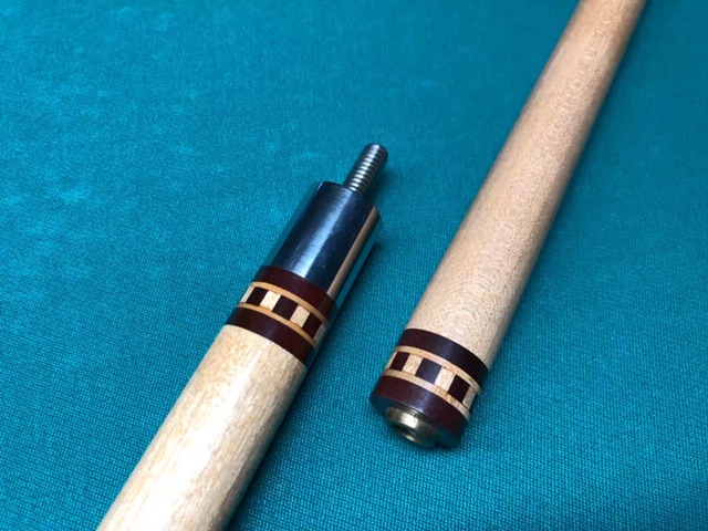 My friend's uncle left him this cue when he left this world. As told to him, it was made in the Baltimore area for his uncle as a birthday gift in the late 60's. Hoping the good folks here might have an idea. I had the tip and ferrule replaced by a gentleman at my local room. The ferrule was the same color as the butt cap originally. Looks to be made from a house cue butt? There is a tan bumper on the bottom. There is a B etched into sleeve. the inlays on the shaft collar and butt collar are nicely made. I've hit with it a bit, hits like a sledgehammer. It's about 56 inches long i think.
