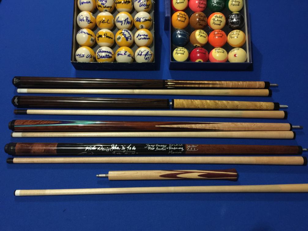 I have 2 sets of Billiard balls. Set on left signed by various pros. Two balls signed by 2 different players for a total of 18 signatures. The other set signed by the "Rocket" Rodney Morris. Also have 2 Gulyassy cues (1 being a break/jump cue). A Patrick Diviney cue. Another cue signed by 6 different pros. And a jump stick. I also have a dealer case that holds 10 cues. Looking at selling the entire lot for a deal. Email me at poolmstr252000@yahoo.com for more pics and information.