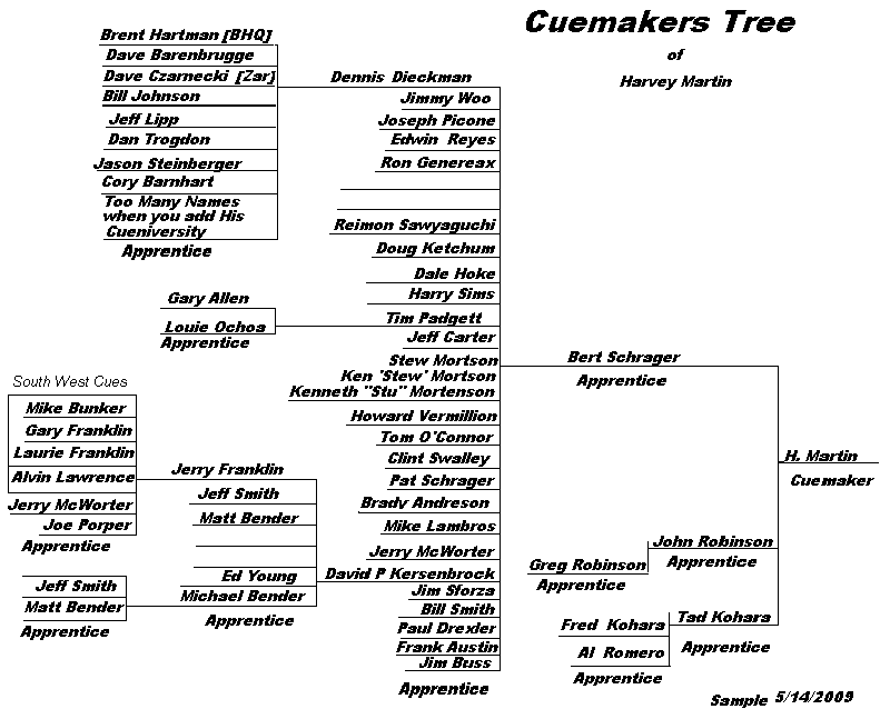 BlackScorpion said: I am interested in making a tree diagram of cuemakers and who thought who. Can anyone help? Click to expand... This is a very interesting idea, I've never seen one. This would involve a good bit of researching. Good luck, would love to see the lines traced back. The Billiard Encyclopedia would be a great place to start.
