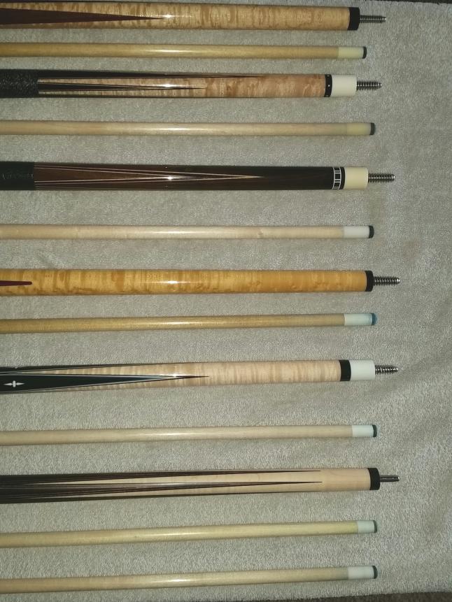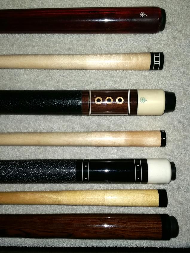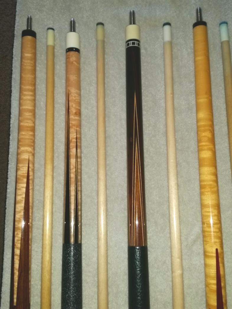 New shaft from Greg Sowder, the butt was not refinished it is in great shape orignal leather wrap, rosewood on rosewood, 13mm shaft, ivorx ferrule wizard m tip, around 19.5 can change weight, cue is stright together or apart.
