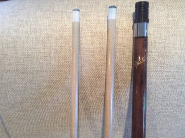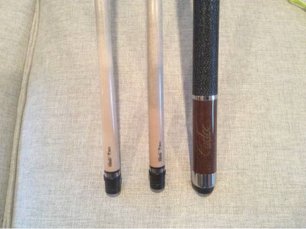 Cuetec R360 playing cue with 2 shafts. Very good condition. Both shafts have BRAND NEW milk dud tips from Keith Hanssen. Butt weighs 14.5 oz and is weight adjustable. Shaft 1 is 12.5 mm tip and weighs 3.56 oz. Shaft 2 is 11.3 mm tip and weighs 3.10 oz. Included is matching Cuetec joint protectors and a couple weights to add if you would like. $250 for all shipped CONUS
