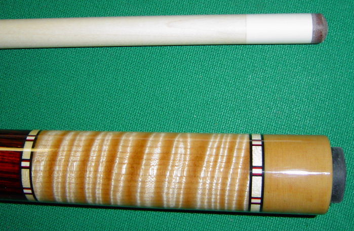 here is a nice piece of curly that I used for this cue it has 4 recut pionts, bloodwood and cocobolo which do not really show up that well but the handle section is a nice straight grain.The cue is for Jimmy Nou,he is a good player out of country club in Chelmsford Ma.