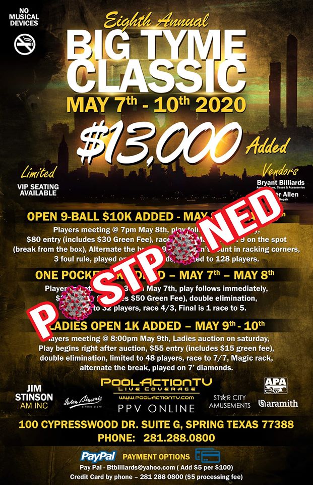 Pat Fleming's International 9-Ball Open in Norfolk has been postponed. From the press release: