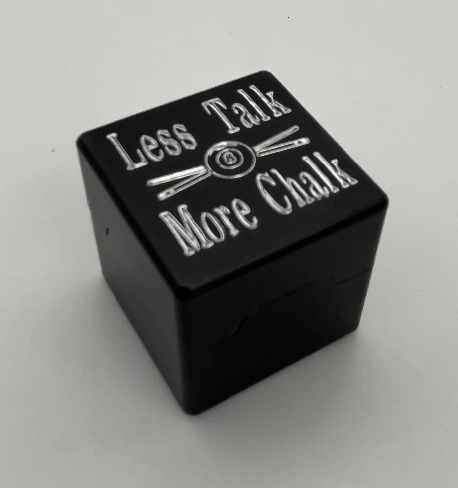 Solid aluminum pool cue chalk holder. No more chalk dust all over your cue case. Personalized with initials, names or select from our billiard sayings or designs. Choose from Black or Gold finish ( Pink finish coming soon ) Choose 2 designs to be engraved on the top and bottom. ( choose the same design twice if you want the same design on both sides) Engraved into the aluminum with a diamond tipped bit on our CNC machine. Magnetically closes, includes 2-sided adhesive pads to hold the chalk tight in one half. ( Chalk not included ) Choose color and 2 designs at checkout. Contact us with names or Initials needed.