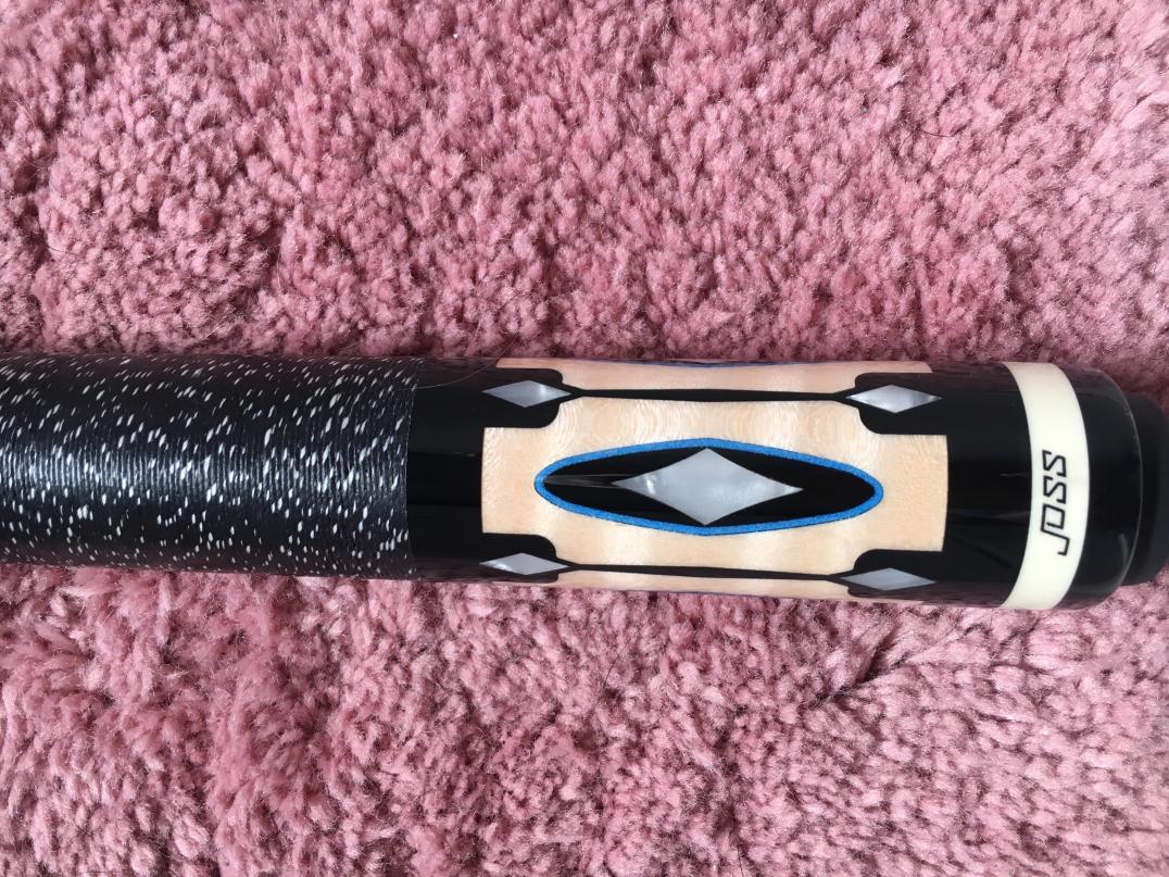 It has Curly Maple butt and forearm...It has 4 points of Ebony with different shades of Blue veneers and Pearl Diamonds front and rear...It has a Black with White specs Linen wrap....A 5/16 x 14 SS joint....It has stitch rings at SS joint...