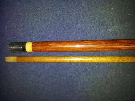 Made by Gabriel Cues and come with a lifetime warranty. The break cue has a stacked leather wrap with a phenolic ferrule and a hard leather tip. The jump cue has a phenolic ferrule and tip. The shafts also are interchangeable. They are both decorated with phenolic ringwork. Not sure on the exact weights but I can get them if you are interested. The break cue hits them like a sledgehammer and the jump cue effortlessly lifts the cue ball in the air with great control.