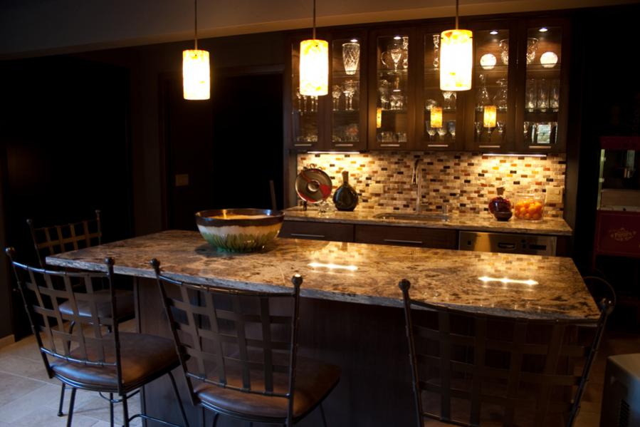 When I saw the backsplash, I couldn't help but post some pics I took of my employer's basement, built-out over the last year. In the kitchen/bar they chose a very similar ceramic back splash that you found, and one nearly identical to yours for their guest shower. The stone tile on the shower wall is a travertine product we sell called "Windsor". (Yes they do have a pool table... not a commercial quality one but it looks good in there. The stone in the billiard room is "Cedar Creek".)