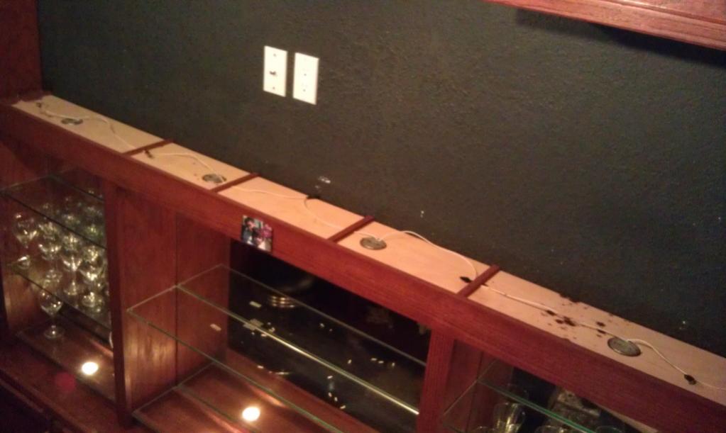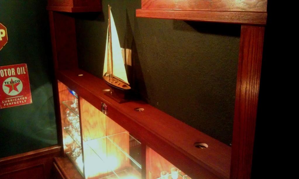 I was ready to put up the Flat screen TV so I needed to cap the bar shelf. I added spacers to clear the wires and I cut holes to let the lights breat. They get hot.