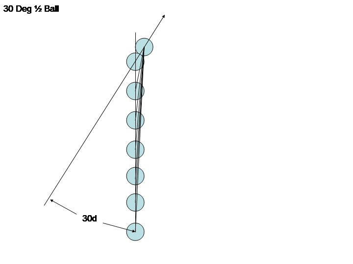 Back to your message. Here is a center of the CB aimed at the edge of the OB. The ghost ball is on this line and the CB is also on this line at differeent separations away from the GB and edge of the OB. All of the different CBs are on this line and the 30 degree angle doesn't change.