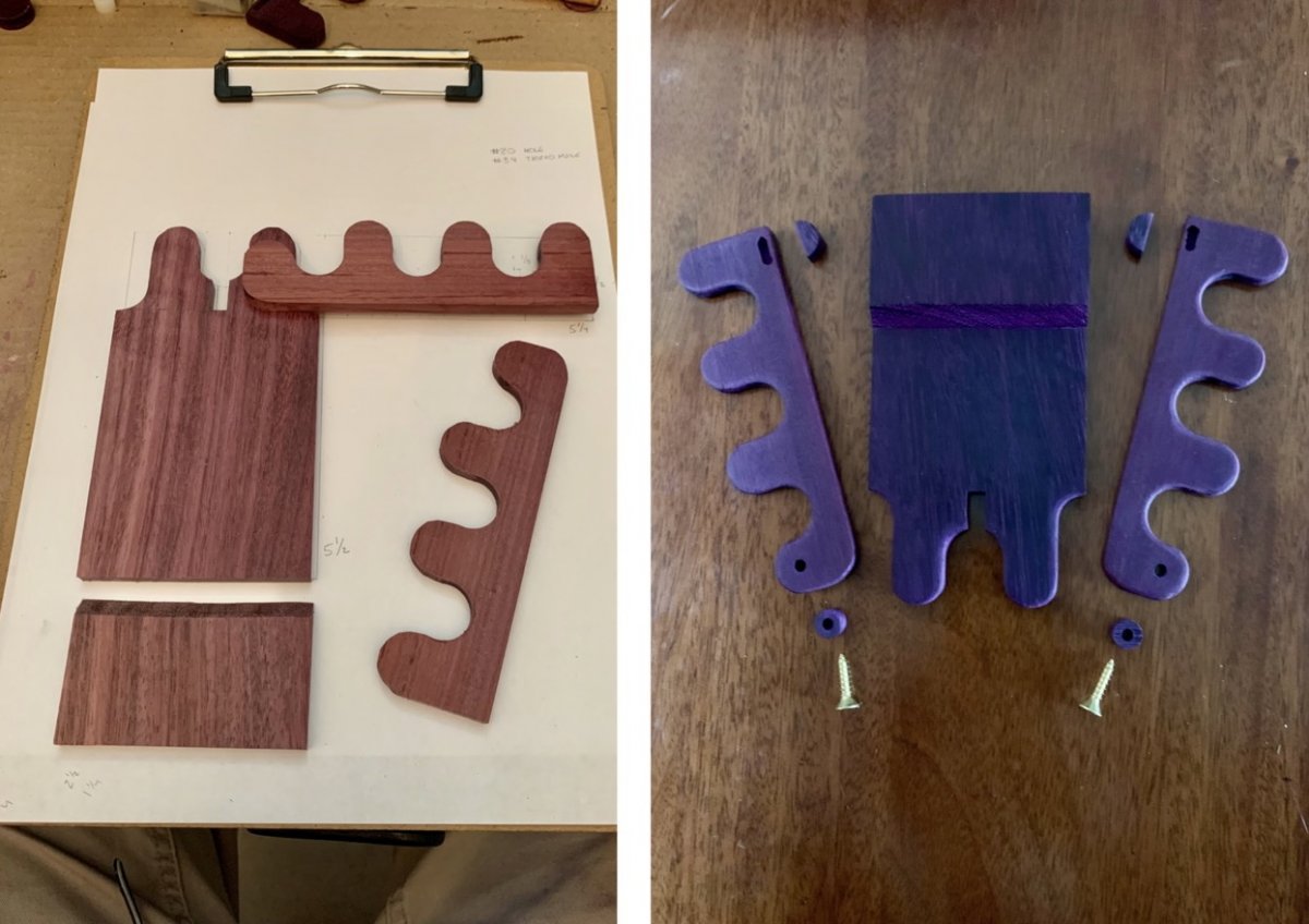 As for purpleheart turning brown after a cut, it's typical. I put a finished cut cue in the sun for an hour or so before finishing. Sometimes I use an industrial heat gun while the wood is spinning and run the heat up & down slowly. Turns very deep purple. Tried putting some under a UV light once but it didn't do anything.