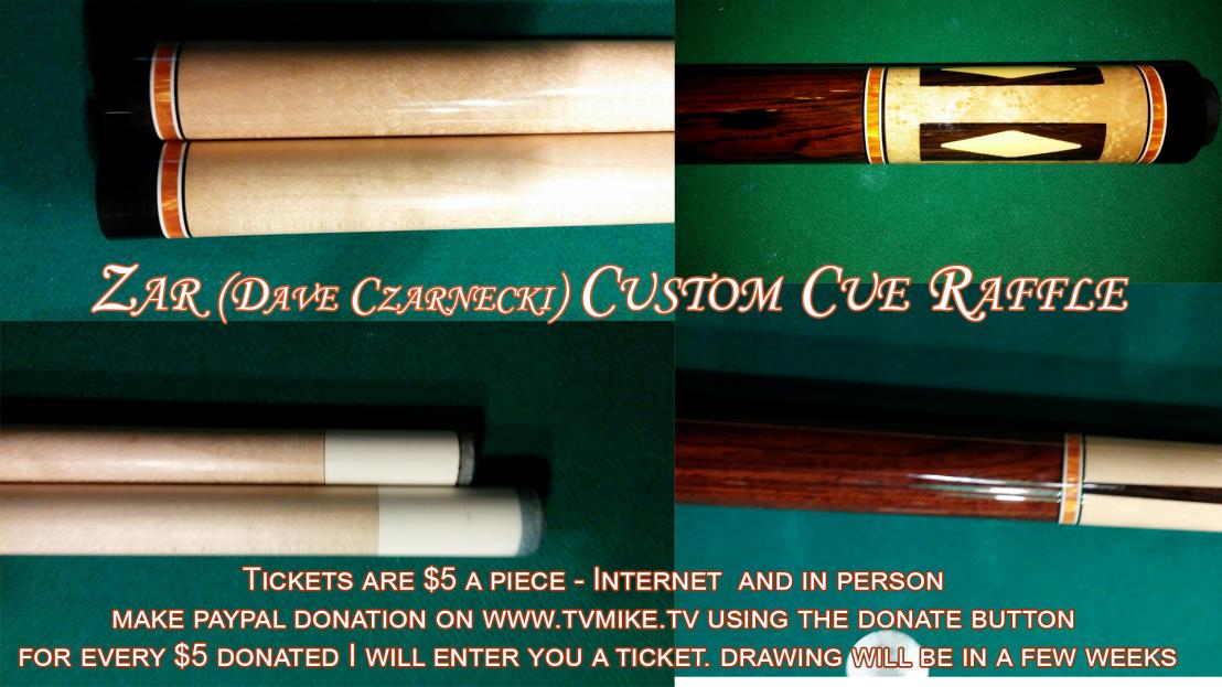 Dave Czarnecki makes "ZAR" cues, he is a faithful viewer of mine and out of the goodness in his heart he donated me this cue to raffle off to make up for all these car repair bills I had the other week. I wanted to keep the cue but I ended up finding one in the area and I bought it myself. I don't have much experience with lots of custom cues but it feels amazing to me. The hit as I'm told feels like an old huebler. I'm excited to play again. Thanks for the support.