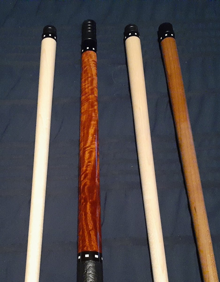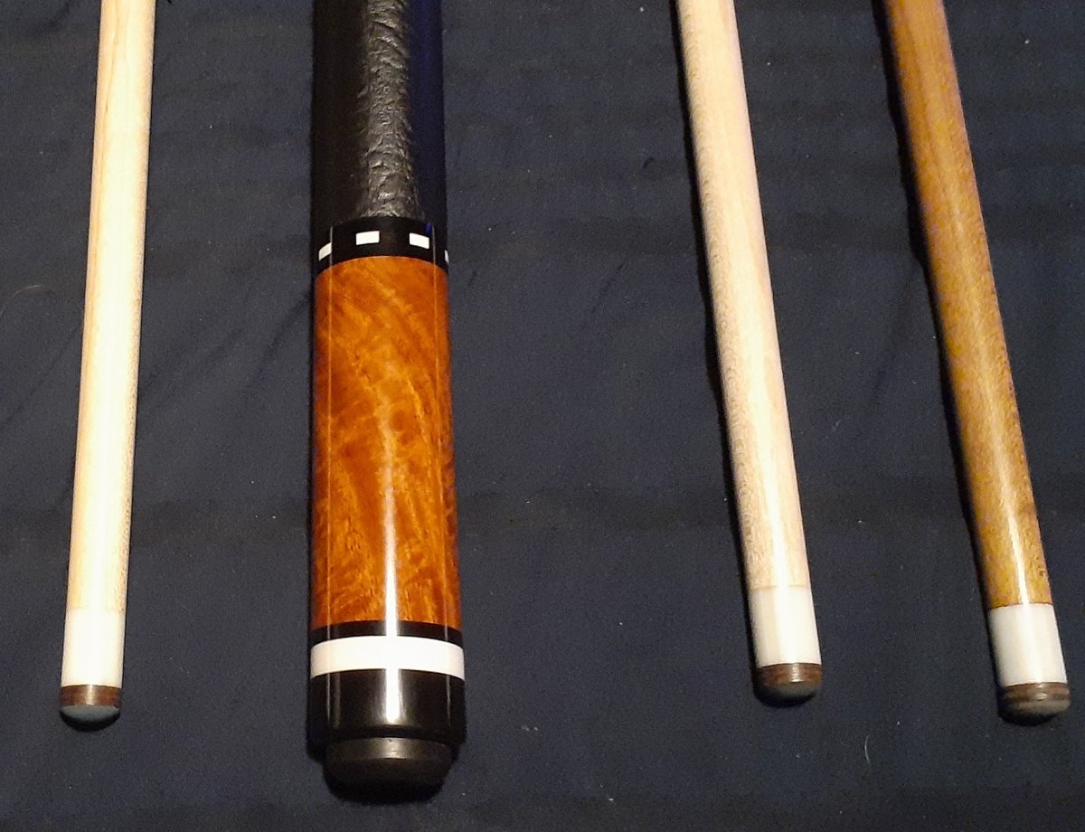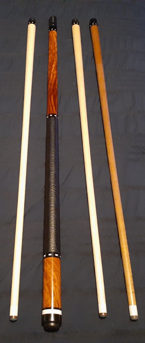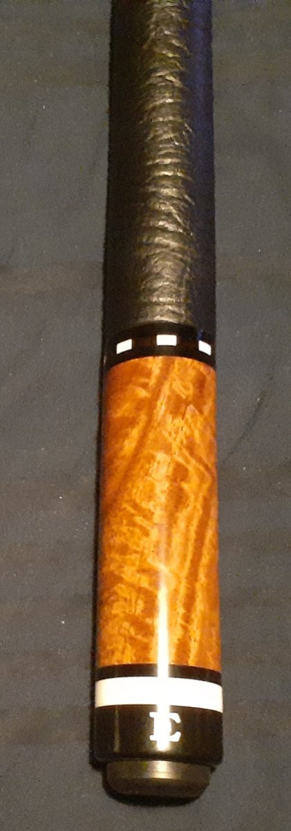 David Elliot cue out of Chris Nitti shop for sale. Butt 15.99 oz., 29 1/8". Shaft 1 13mm, 4.09 oz., 29 1/8". Shaft 2 13mm, 4.05 oz., 29 1/8". Shaft 3 13mm, 3.43 oz., 29 1/8" Kielwood. Not sure of the wood in Forearm and Butt. Might be Waterfall Bubinga. Check ring work, leather wrap. Radial pin. New Cue test hit only. Cue is perfect. David Elliot is Chris Nitti's son in law. They share the same shop. Very high quality Cue. Nothing leaves the Nitti shop unless it is perfect. Asking $1600