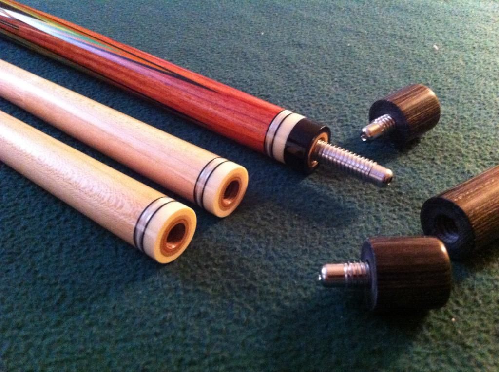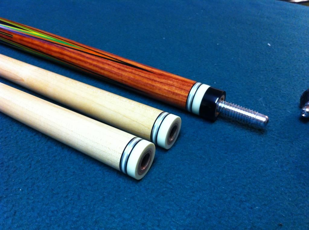 Here is Dav's new cue he designed and I built to his playing spec. 2 12.75 shafts with 1/2" Ge Micarta Ferrules on my parabolic compound taper in to a super pro configuration.