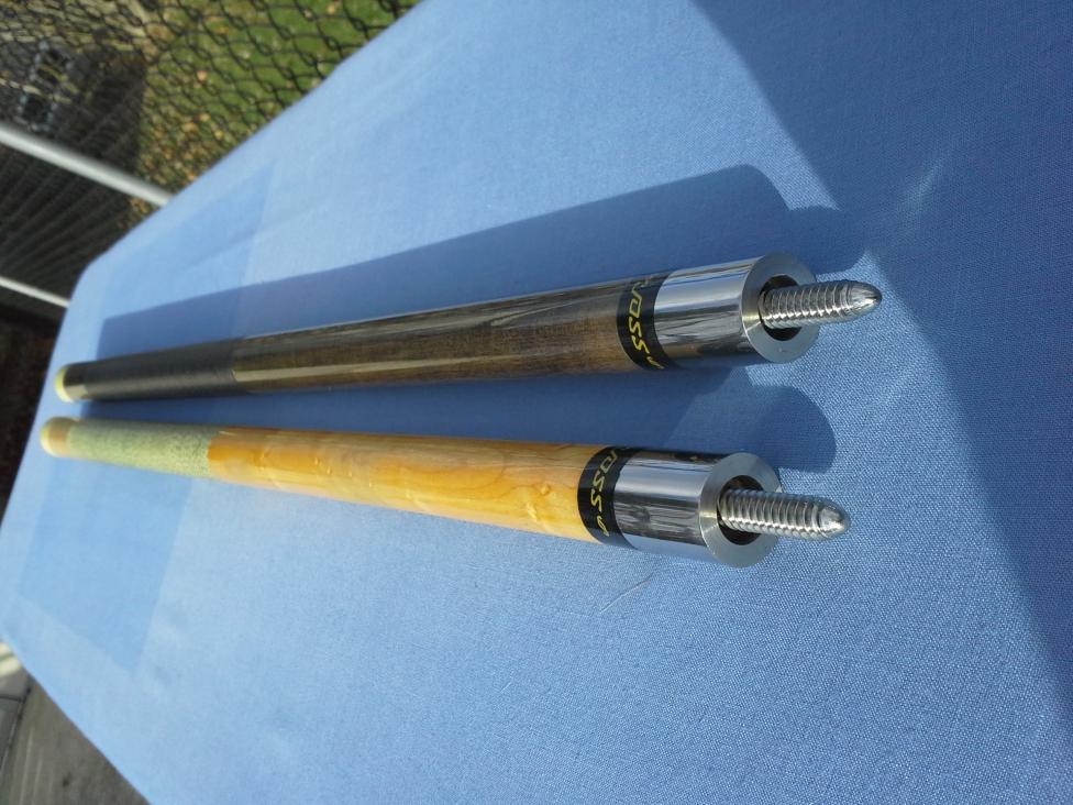 Hi guys, I have 2 Gold Letter era Joss plain jane butts. Both were players cues so they have some obvious wear (mostly in the buttcap) which can be seen in the pics, as well as some wear on the finish of the birds eye Joss. The linen on both is in excellent condition, and the birds eye on the BEM cue is nicely figured. Both are super solid, straight, and in awesome playing condition. Throw an LD shaft on either and you have a hell of a player for cheap