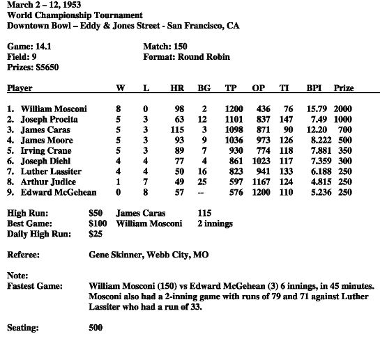 Mosconi won some of the 12 challenge matches by over two to one ratios, such as this:Jimmy Caras was one of the best 14.1 players in history and Willie beat him by 1219 balls,how strong is that?