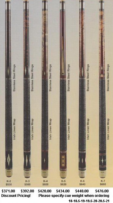 Did Tascarella design the line of cues that this cue came from? That is pretty cool if he did. I wish that I could find the 2nd half of this Colored brochure. This site only showed the 1st half of this line of cues. From K-2 through K-7. Is this the same line that my cue came from? K-11? Just out of curiosity, it would be cool to learn what this cue retailed for. Do you think these cues were as good quality as the Falcon line of cues? Thanks for all the info.