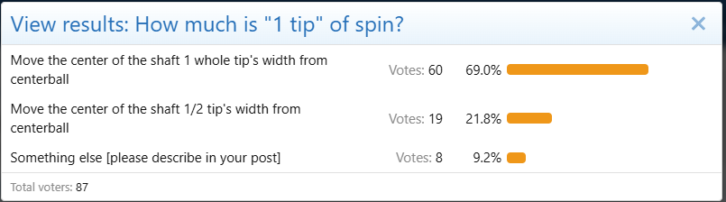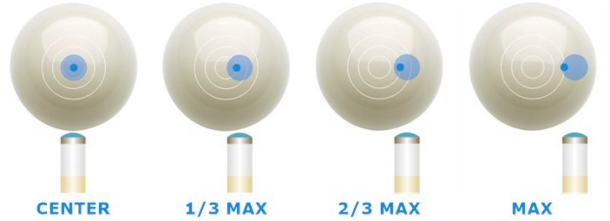 Much clearer. Maybe you can indicate graphically how the contact orbits as english is applied.Here’s the illustration referenced above, comparing tip offsets and contact points for center ball, 1/3, 2/3 and 3/3 of maximum offset. I think it illustrates that the clearest way to describe tip position is contact point at fraction of maximum offset (i.e., “1/3 right”, “1/2 top left”, “maximum draw”, etc.).