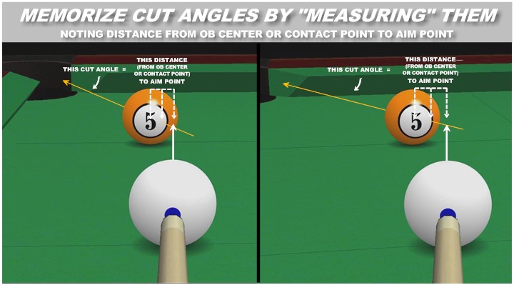 OK, this is all well and good, but how can we actually make a usable aiming method out of it? Well, we don't have to use all those distances or be able to recognize all those cut angles. For example, in fractional-ball aiming, or SAM, or back-of-the-ball aiming, we generally use just a small number of reference aims -- 3/4-ball aim (14.5-degree cut), 1/2-ball aim (30-degree cut), 1/4-ball aim (48.6-degree cut) -- and then we use our feel or experience to aim a little thicker or a little thinner for shots between those reference points. So let's do something similar with distance-from-contact-point aiming.