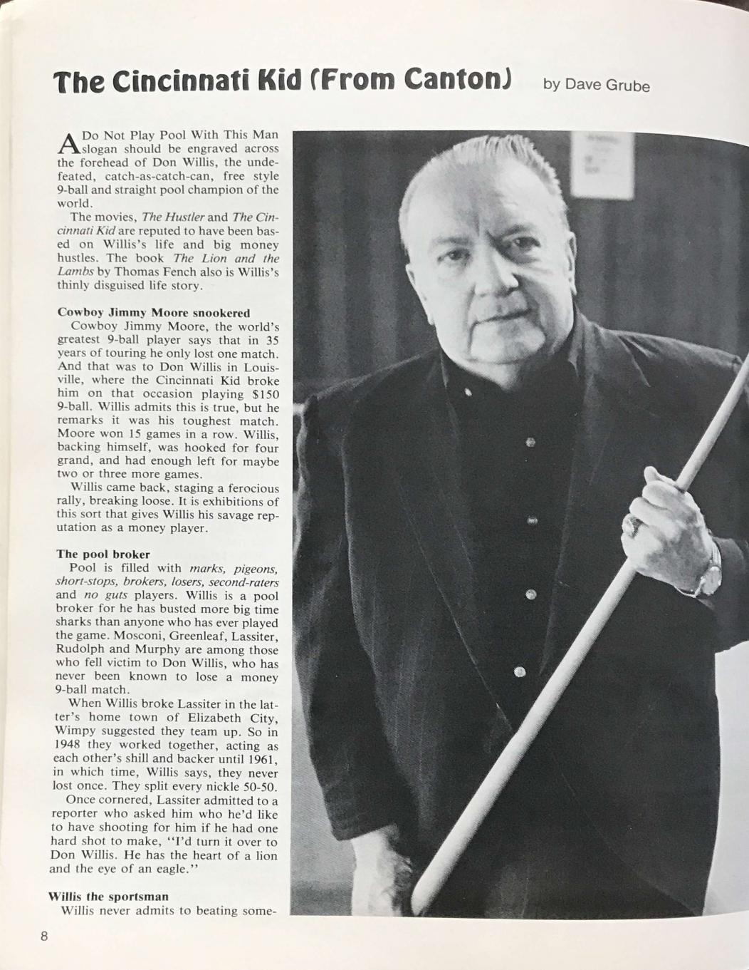 First time I met Don Willis was the summer of 1965 or 1966 as an impressionable youngster of 13 or 14 that had just started hanging around the pool room. Forgive me for not remembering exact dates as it was over fifty years ago.