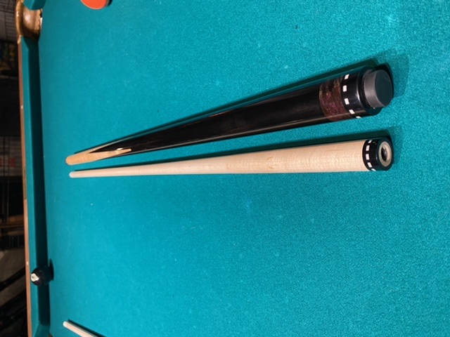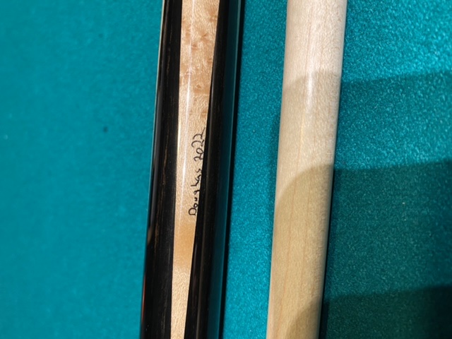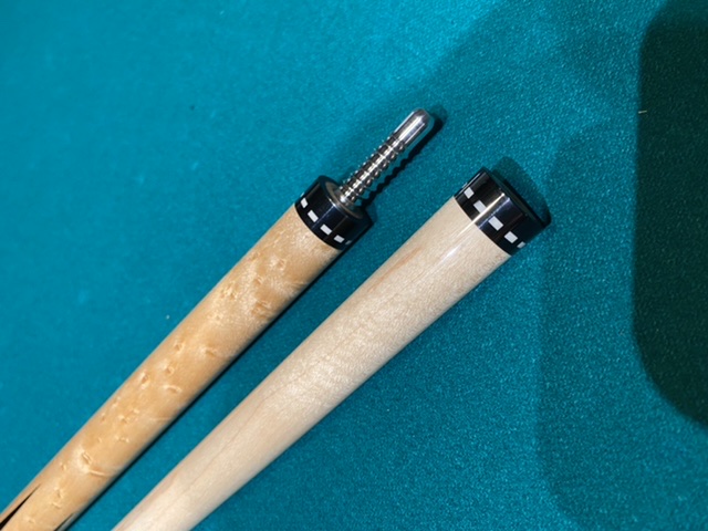 Low deflection shaft 58” played very few games with this cue. Ebony with a fancy ring into birds eye maple with a radial pin 350obo