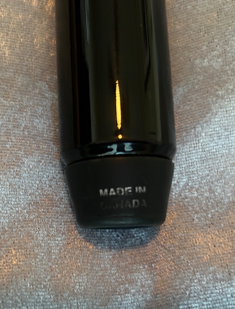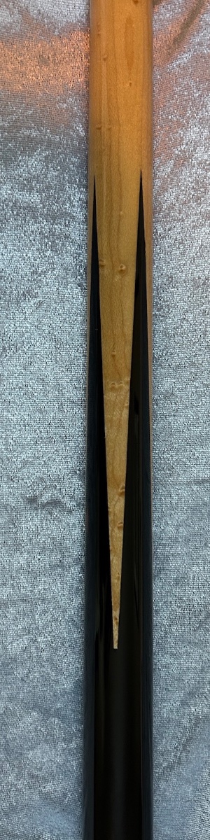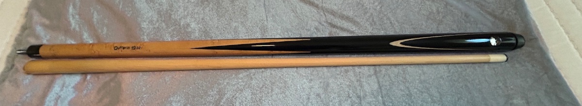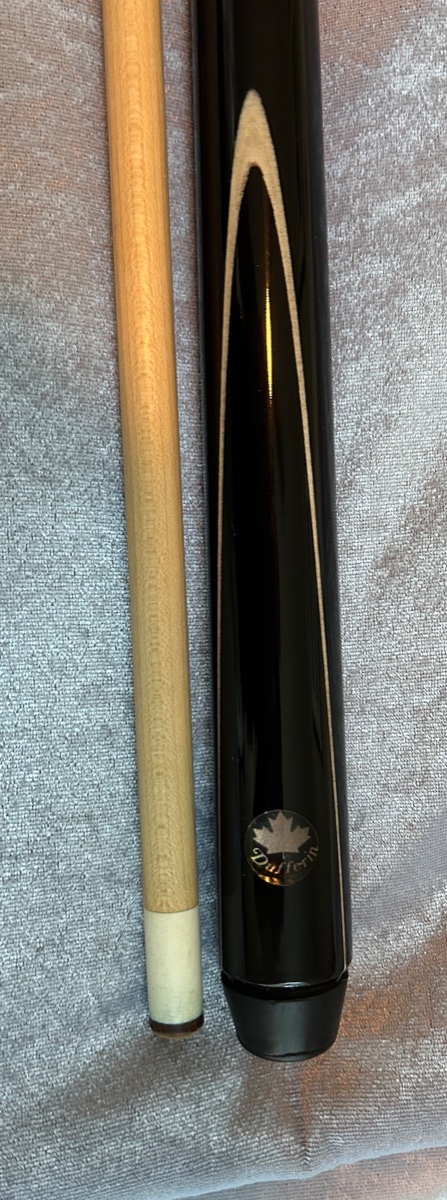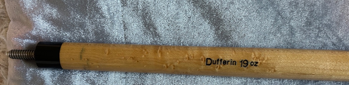 The most Desired Dufferin and the most converted. This one from my collection is just about as mint as they come. Full bright finish, strong Dufferin logo and weight stamp, strong " Made in Canada" bumper marker. RARE- almost unused cue -- Full Splice FOUR Symetric Ebony points into BEM, Strong ebony handle and butt sleeve area- strong butterfly splice completion with clear Silver leaf window. I obtained this beauty directly from a Canadian- a closet queen cue for sure!