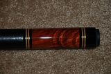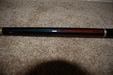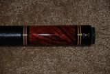 Up for sale is a 2009 Mike Lambros cue, ebony nose with 5 amboyna burl points, 4 veneers, blue, black, blue, black. This cue has the Ultra Joint and also has a leather wrap with double trim rings at A,B,C,D, and E with an amboyna burl butt sleeve. One of the shafts is brand new and unchalked. This cue is a MONSTER player!!! CUE IS SOLD...