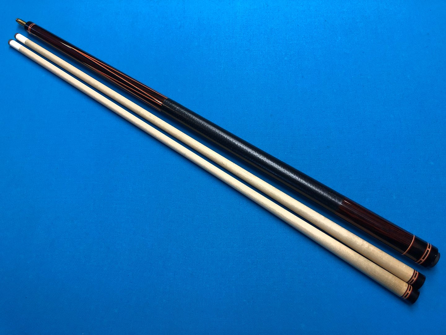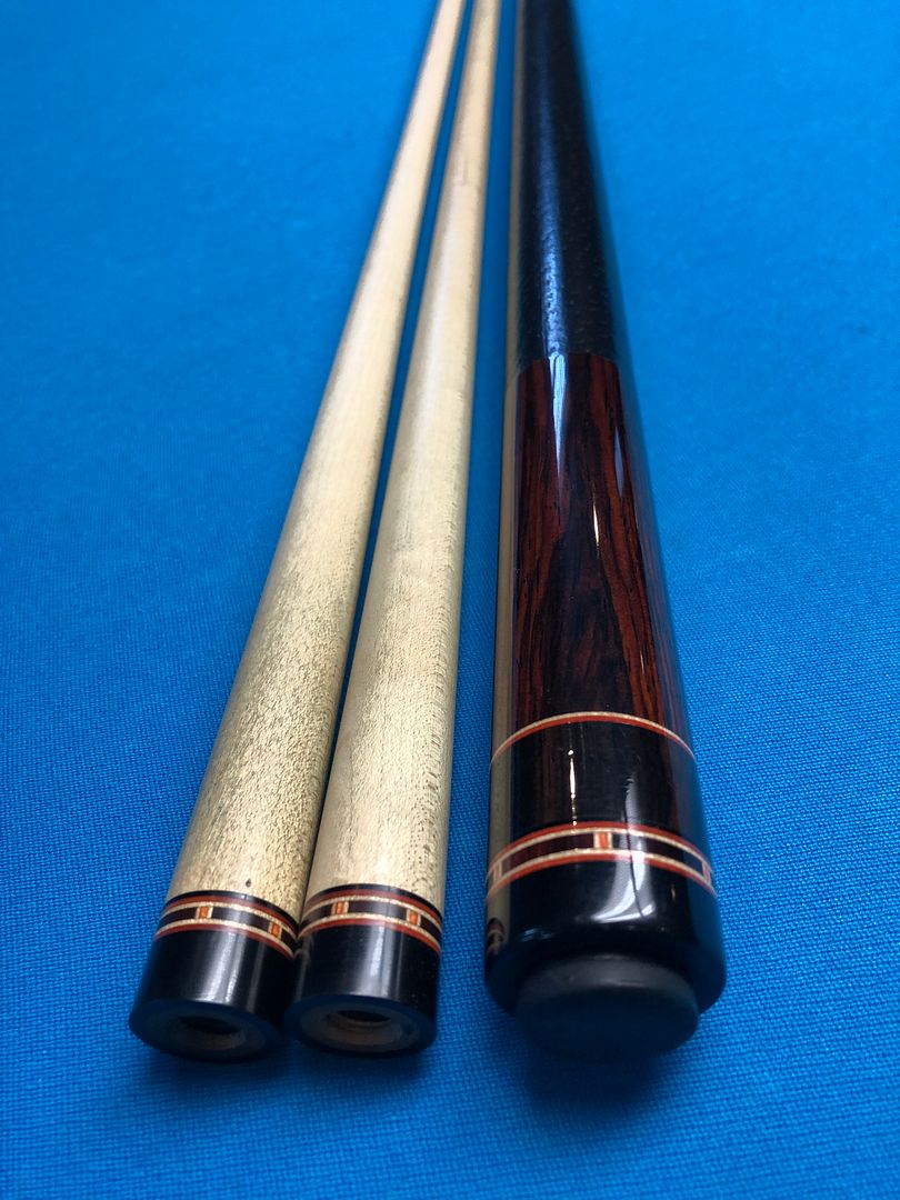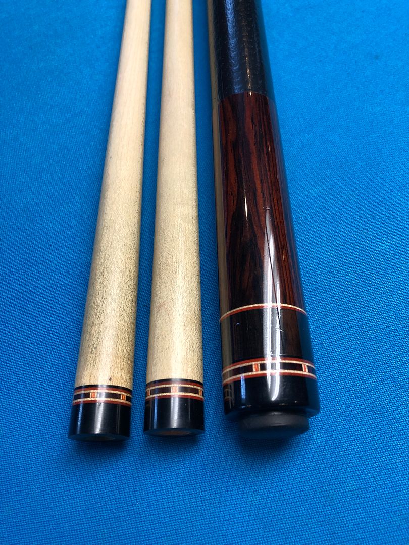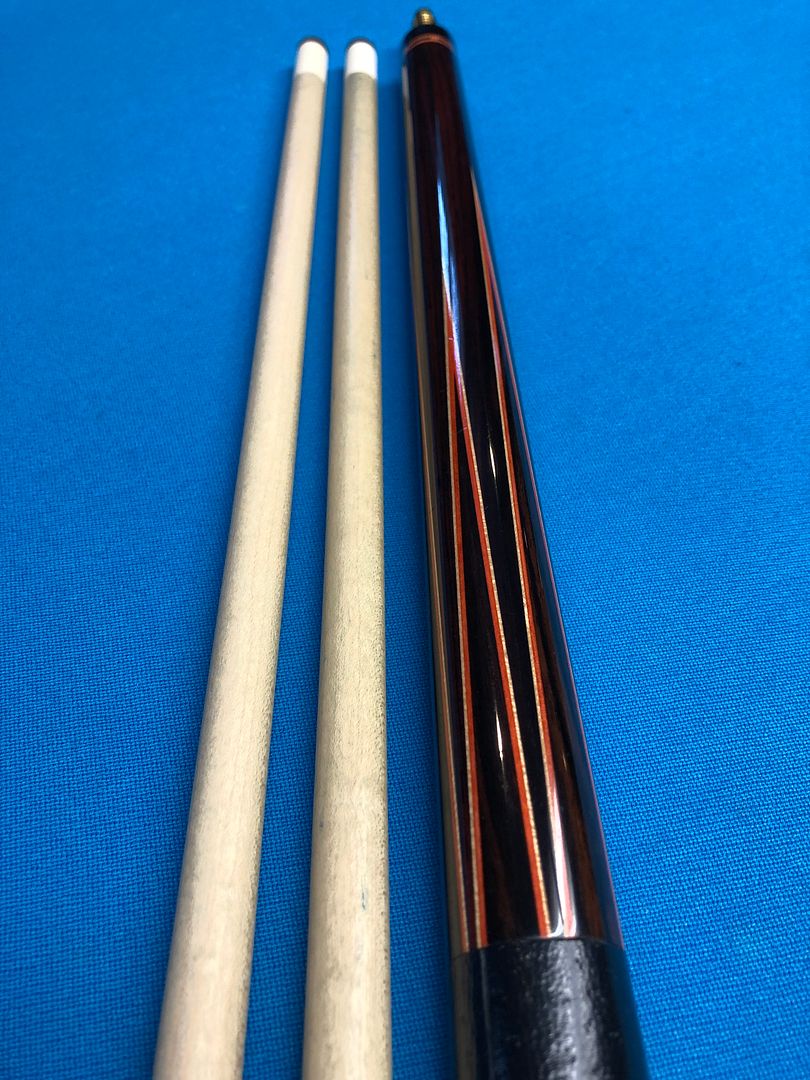 The cue has 6 points of Macassar ebony into highly figured Cocobolo. Two veneers of orange and white. The cue is 59” long and weighs 20 oz’s. Two shafts with ivory ferrules at 12 mm. The cue has a couple very small finish nicks and the leather wrap was installed by Mike Webb and is perfect.